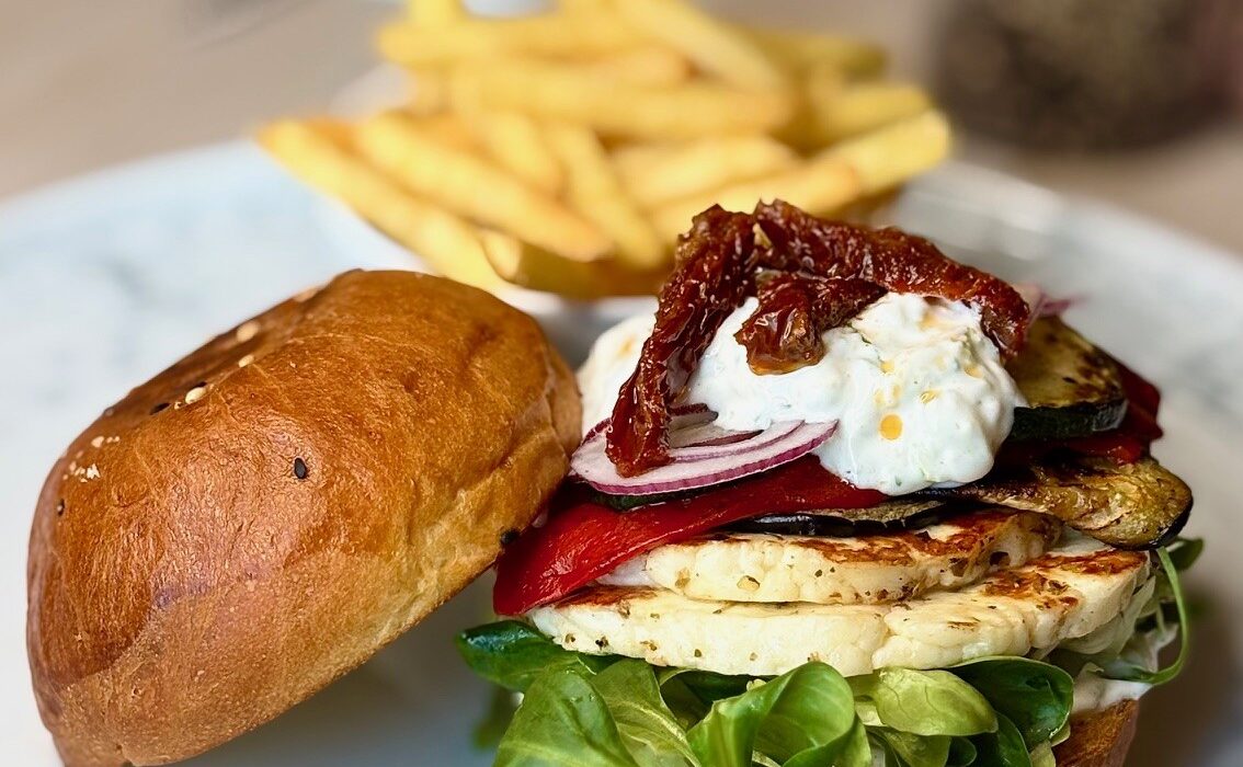 (naše bulka, sýr Halloumi, grilovaná zelenina, trhaný salát, červená cibule, jogurtovo-mátový dressing s okurkou)