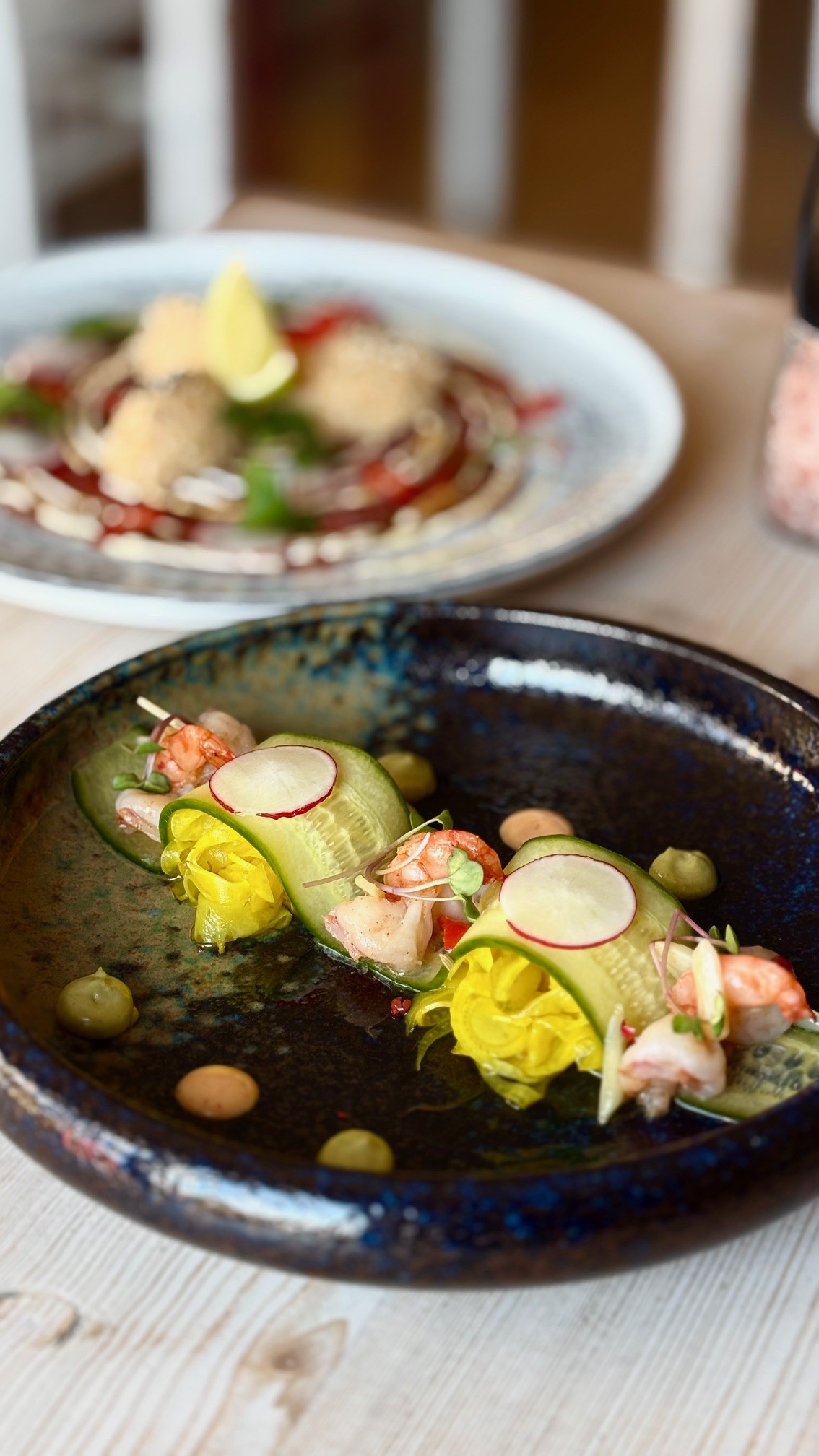 Konfitované krevety, fenyklový salátek s kurkumou, marinovaná okurka, estragonová majonéza