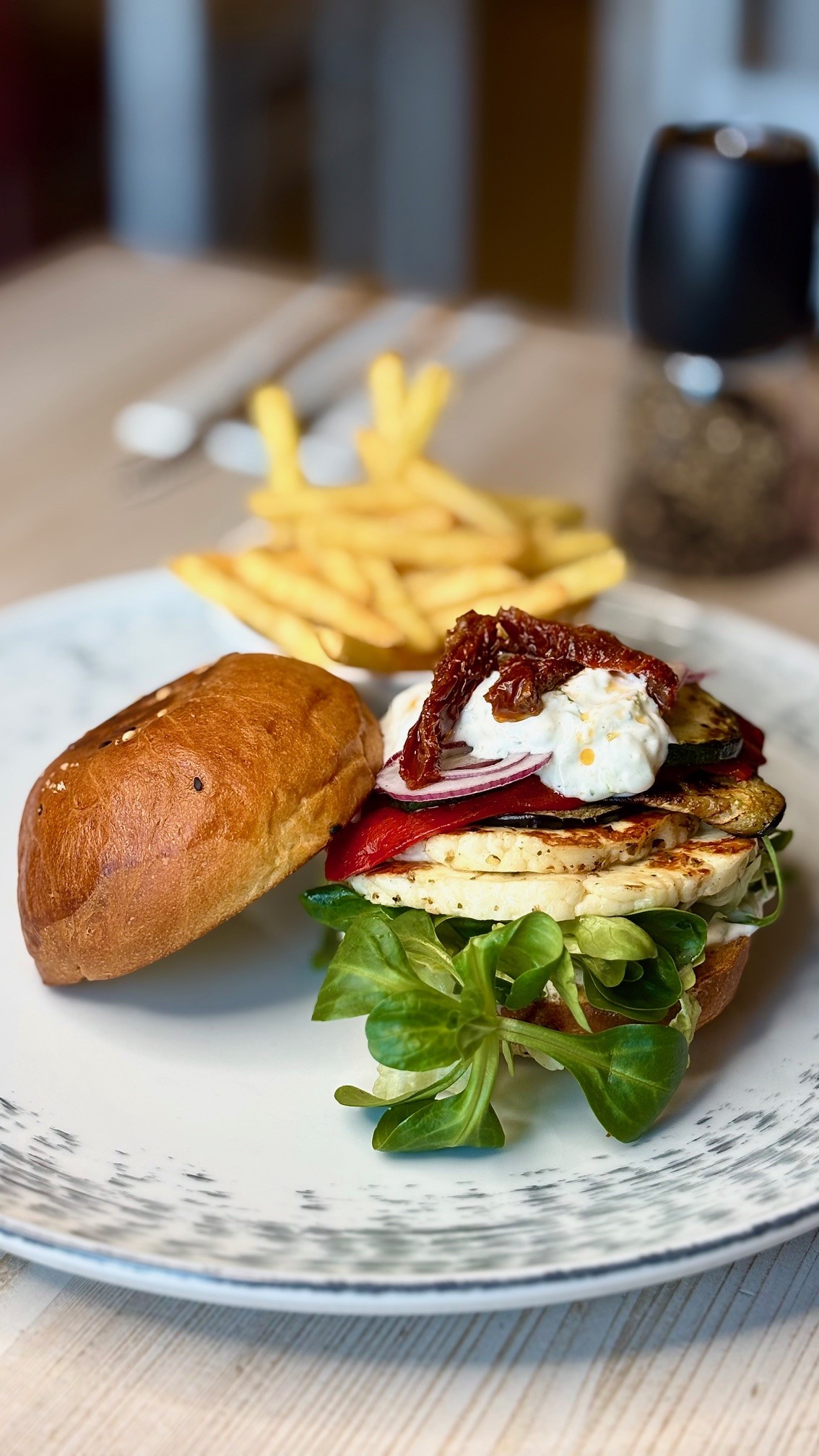 Halloumi burger, hranolky (naše bulka, sýr Halloumi, grilovaná zelenina, trhaný salát, červená cibule, jogurtovo-mátový dressing s okurkou)
