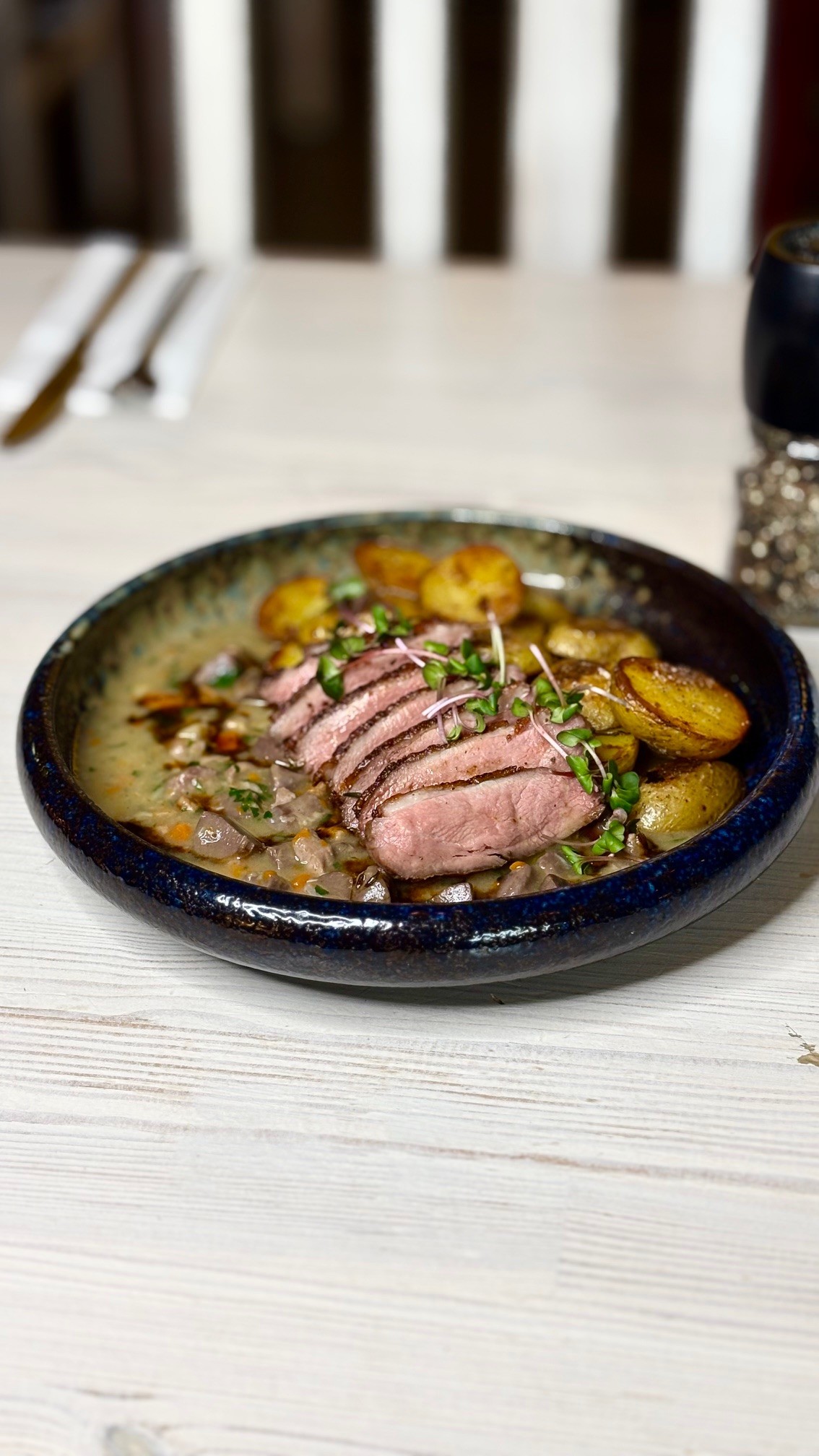 Kachní prso (sous vide), zadělávané kachní žaludky, brambůrky Grenaille