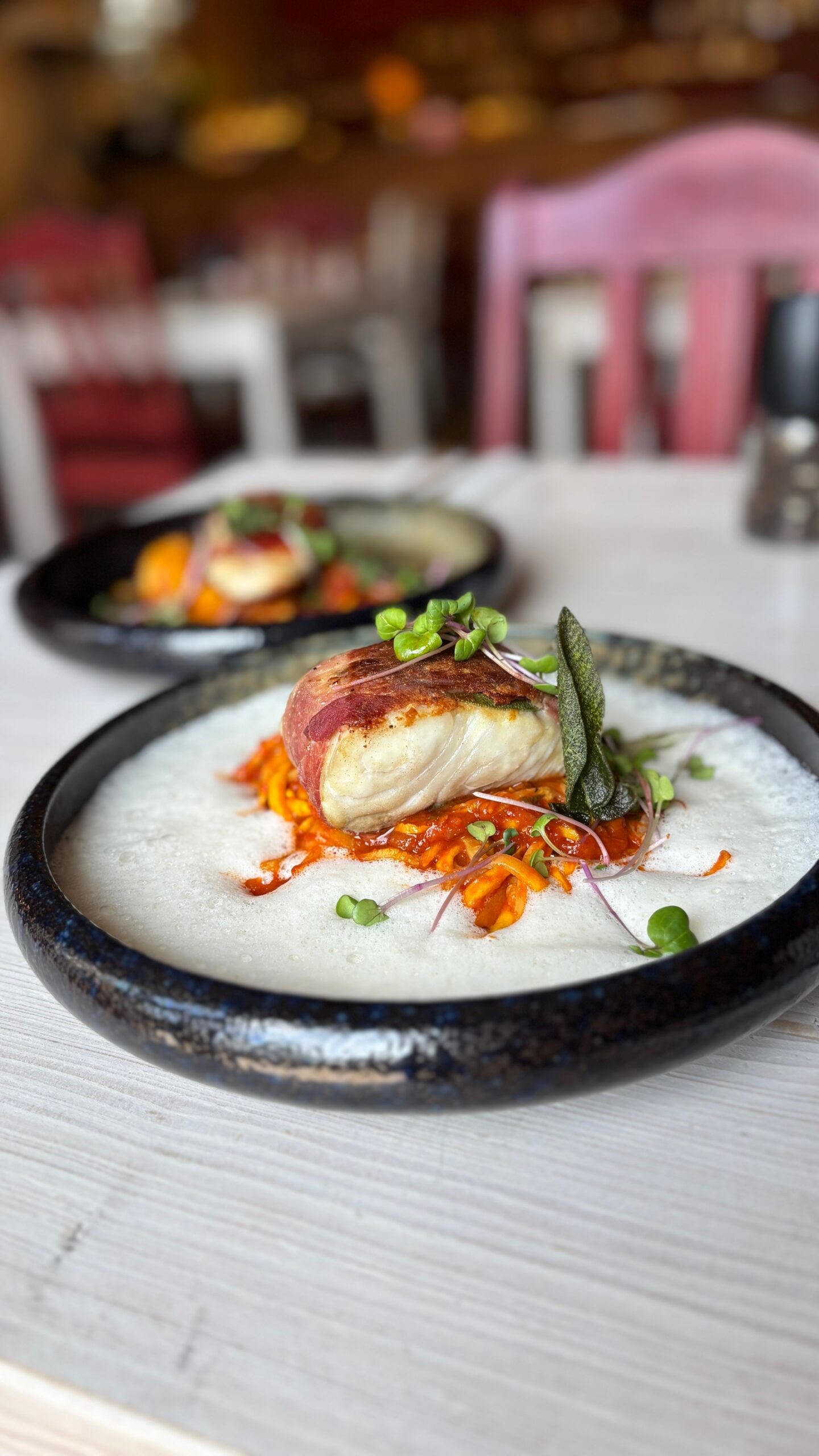120 g Treska balená v sušené šunce Jamón Serrano se šalvějí (Saltimboca), cuketové špagety s rajčaty, brambůrky Grenaille, omáčka Beurre Blanc